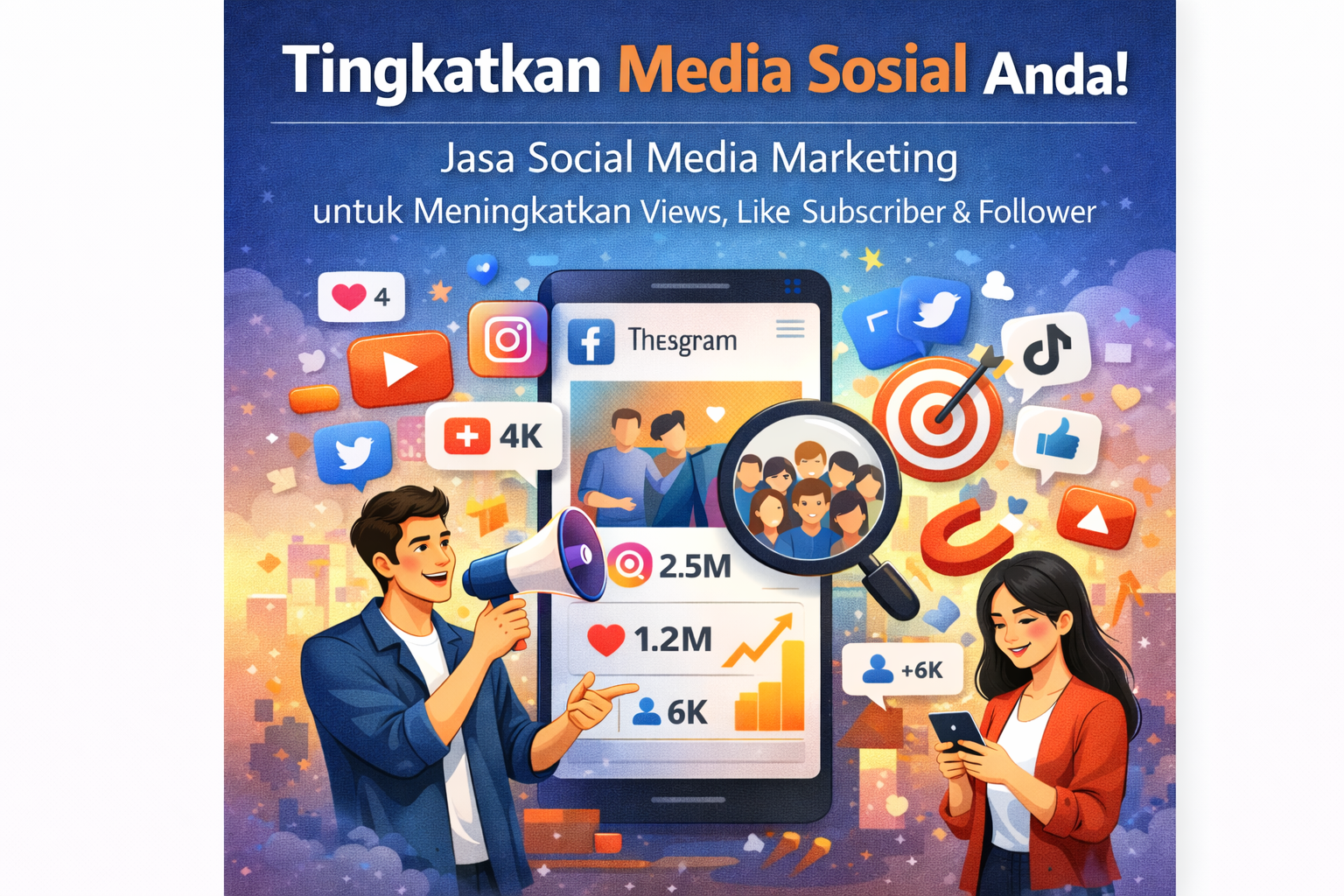 Kami menyediakan jasa social media marketing profesional untuk membantu mengoptimalkan YouTube, TikTok, Instagram, dan Threads melalui strategi yang terukur, aman, dan sesuai kebijakan platform.
